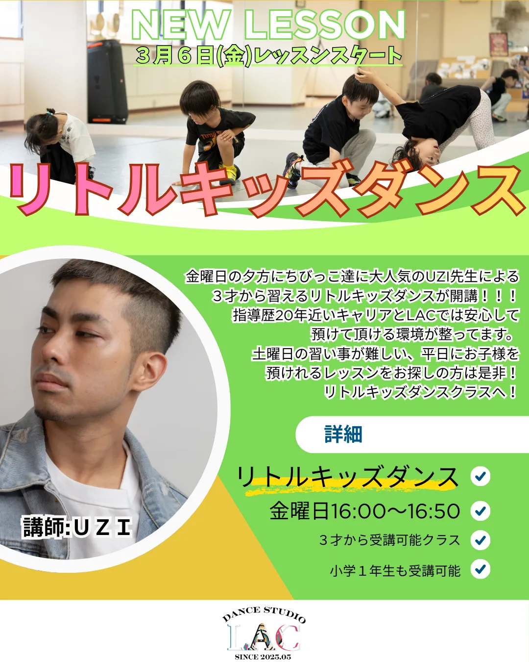 楽しむ事を目的で受けたい!上手くなりたい!プロを目指したい!LACでは初心者に特化した入門クラスや3才から受講可能なリトルクラス、経験者向けのクラスなど豊富に設けてます。ダンスは始める時が大切だと思ってます。ダンスを始めた時にどの先生に出会うのかも皆様のこれからのダンス人生に繋がると感じてます。LACではあなたの目的に合ったクラスが必ず見つかります。