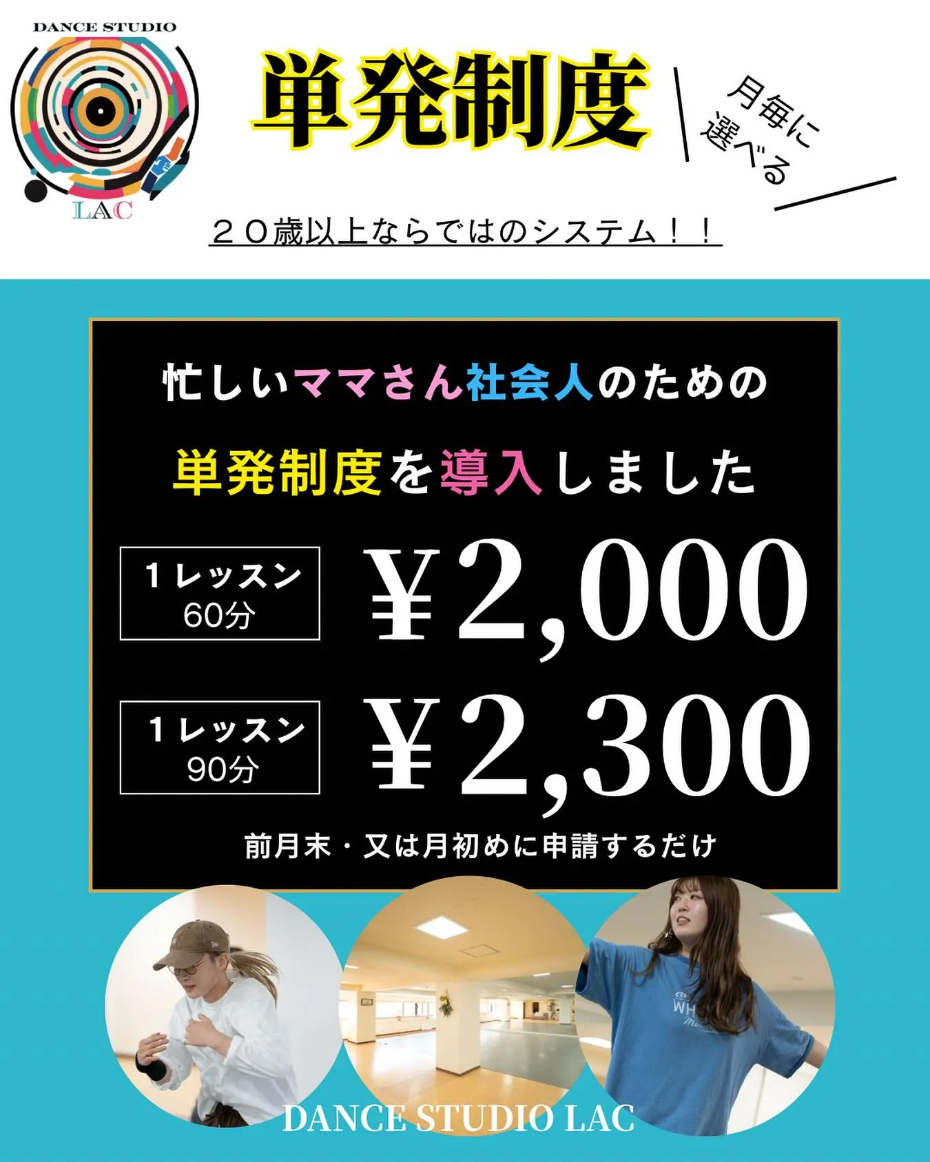 月謝制が基本だったLACですが、20歳以上の社会人やママさんには少し厳しい制度というお声も頂き単発制度を導入することにしました😁