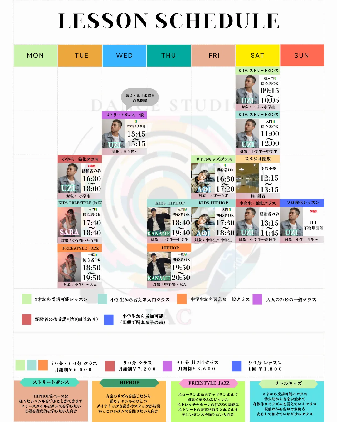 リトルキッズから中高生、そして大人まで、幅広い年齢・レベルに応じたクラスを曜日・時間別にご案内しております。平日の夕方は、放課後に通いやすい子供向けのクラスを中心に、週末は自由に練習できるスタジオを開放しているなど、無理なく継続できるスケジュールを設けています。また、経験者には強化クラスや即興ソロ指導を行い、成長意欲にしっかり応えております。